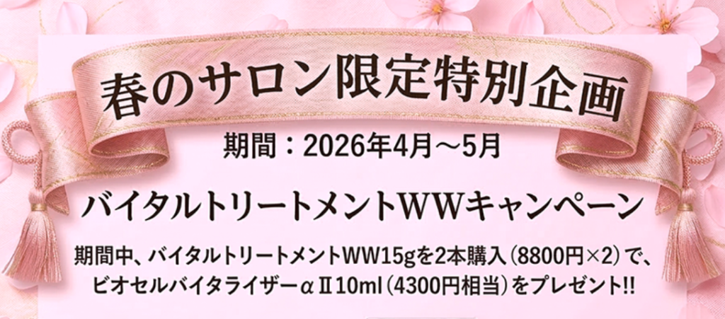 「春のサロン限定特別企画 バイタルトリートメントWWキャンペーン」を行います。期間は2026年4月~5月、期間中、バイタルトリートメントWW15gを2本購入(8800円×2)で... -